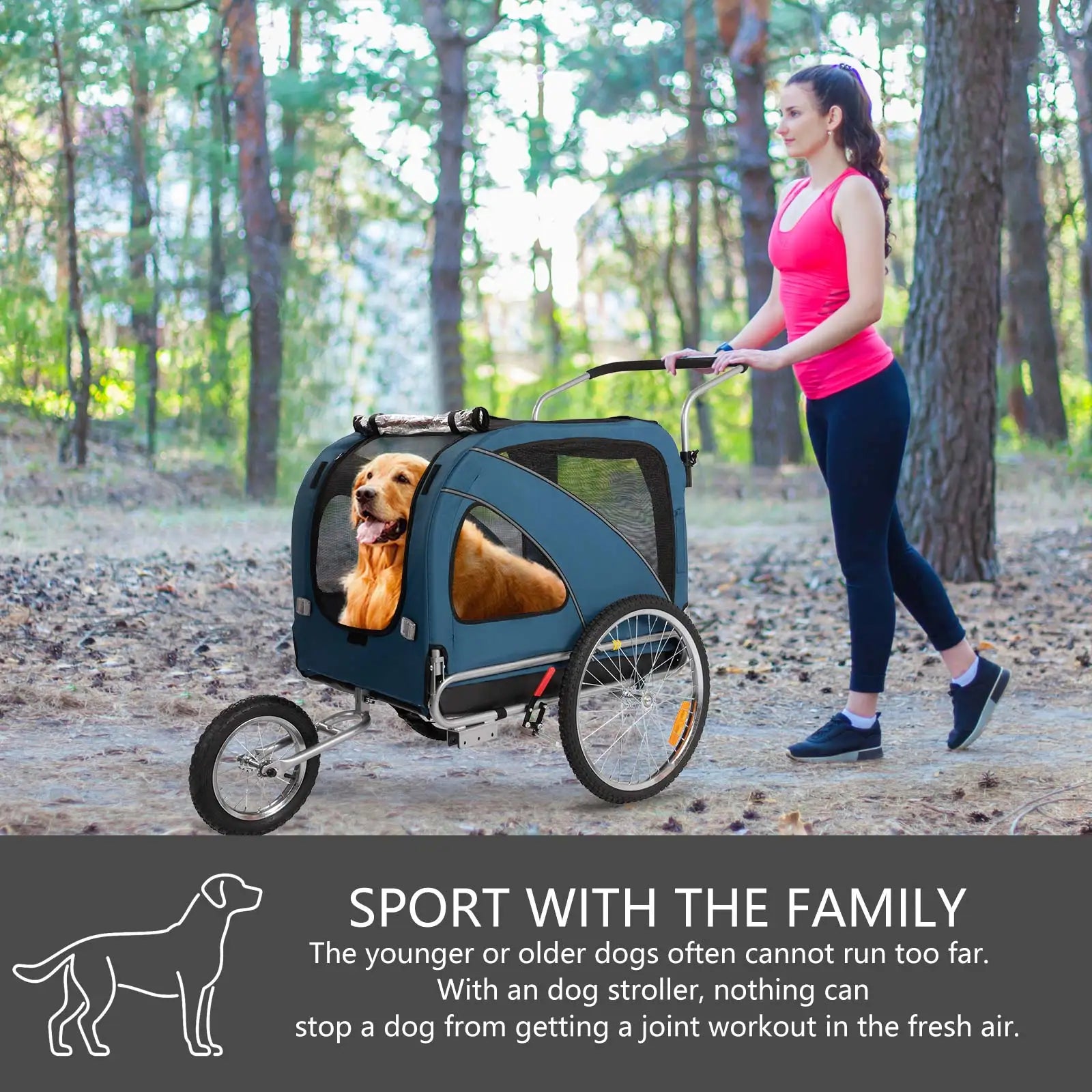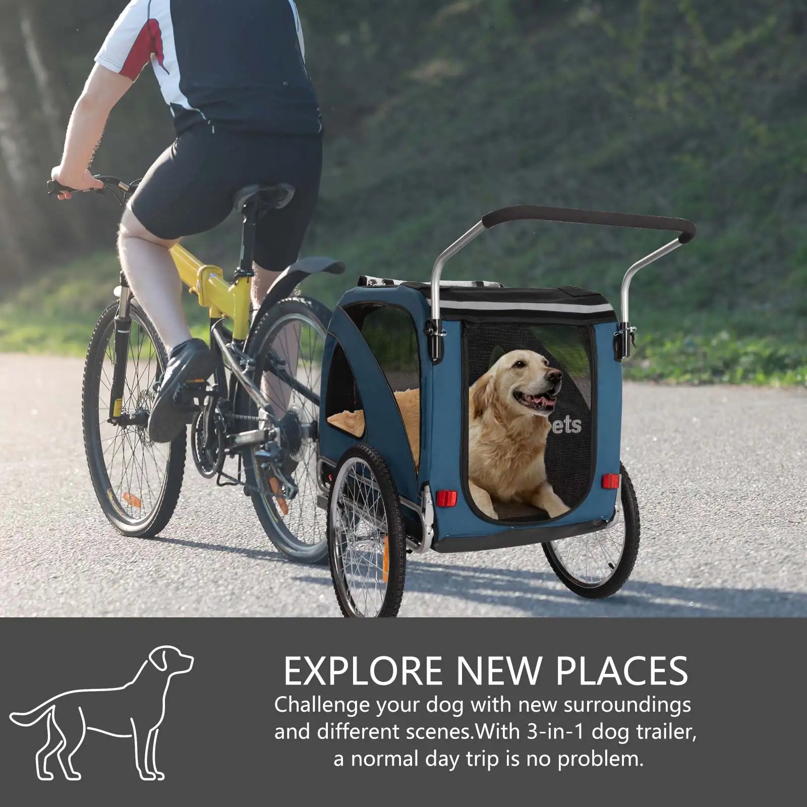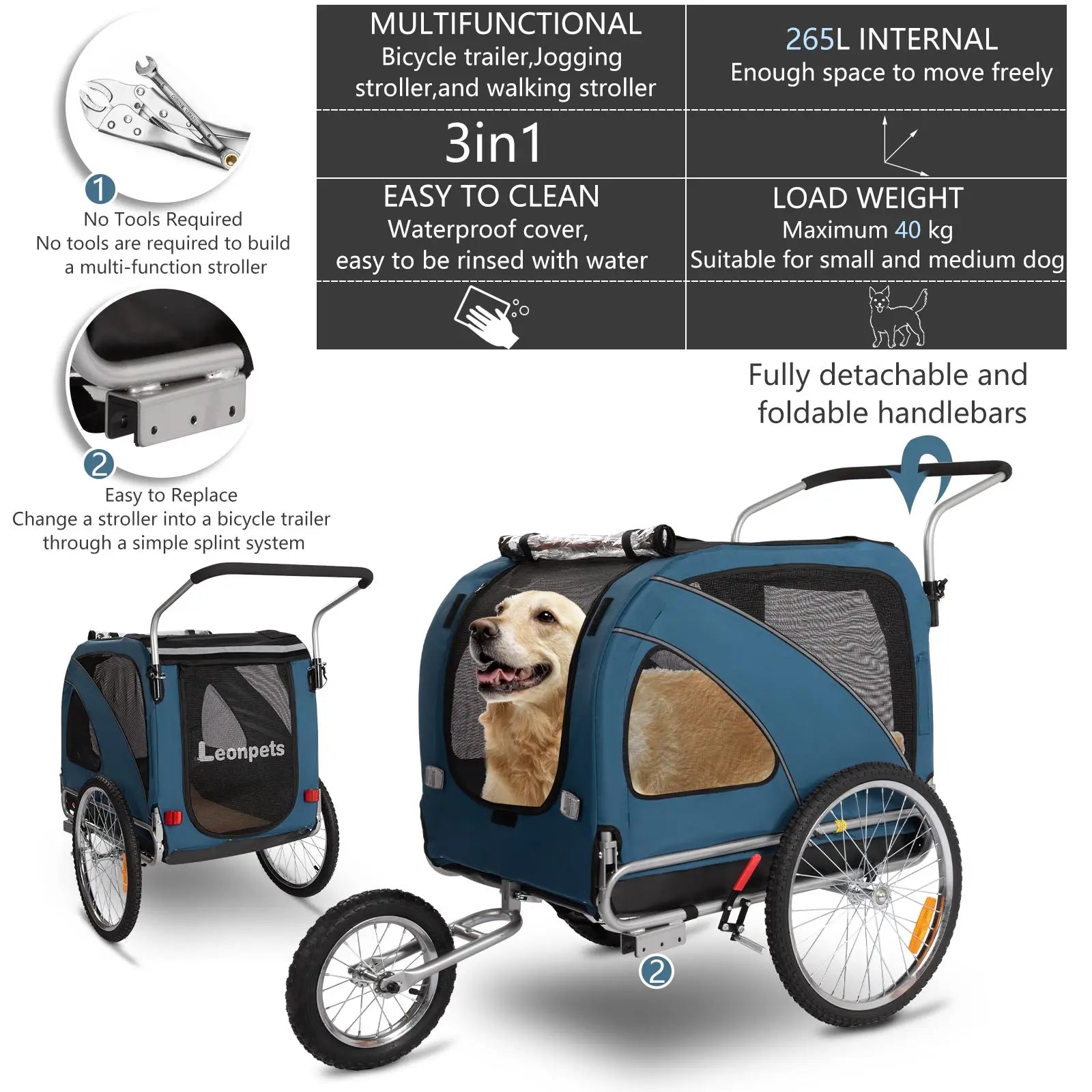 Accommodates pets up to 88 pounds with an internal driving size of 33.9” x 22.1” x 26” (L*W*H). Whether it's a leisurely ride or a jogging session, this 3-in-1 trailer adapts to your needs, offering versatility and convenience.