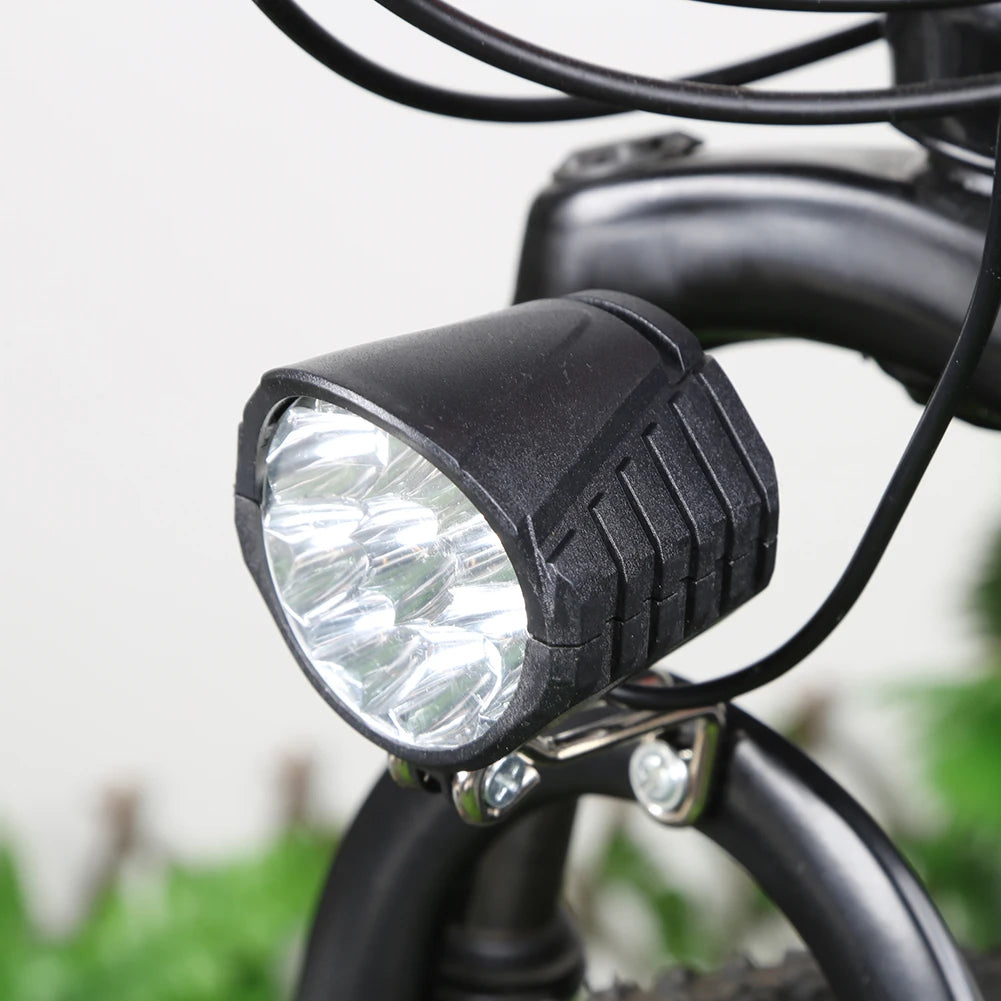 This electric bicycle light combines a powerful front headlight and a loud horn, providing both illumination and an audible warning system. It's ideal for low-visibility conditions, enhancing rider safety.