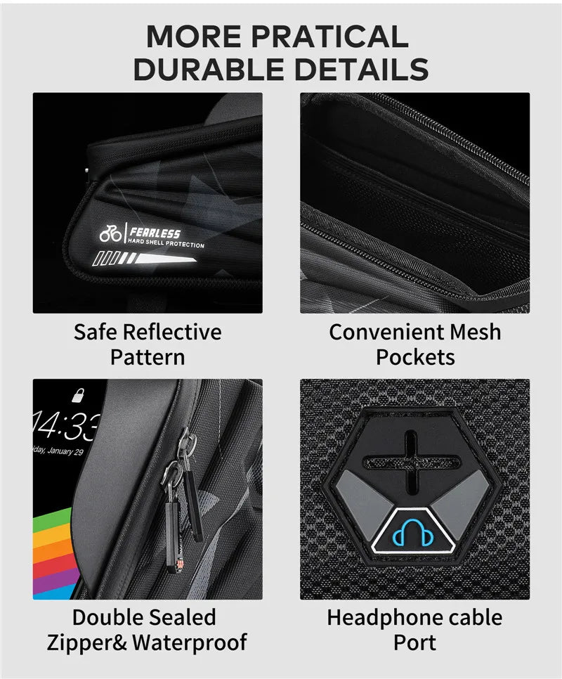 Designed with durability and practicality in mind, the bag includes a safe reflective pattern for enhanced visibility, convenient mesh pockets for easy access to essentials, and a double-sealed waterproof zipper. Additionally, a headphone cable port allows you to enjoy music or take calls without any hassle.