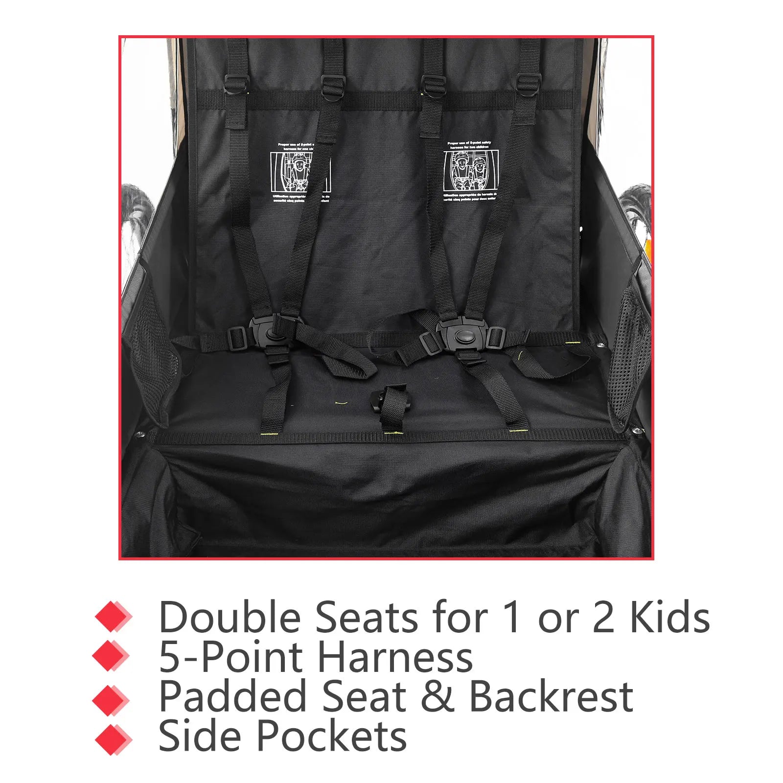 Equipped with two 5-point harness systems and ergonomic seats, this trailer keeps your children safe and comfortable. Side pockets provide convenient storage for toys, and there’s ample legroom for stretching and relaxation. The 48.3cm inflatable rubber tires ensure a smooth and cushioned ride over various terrains.