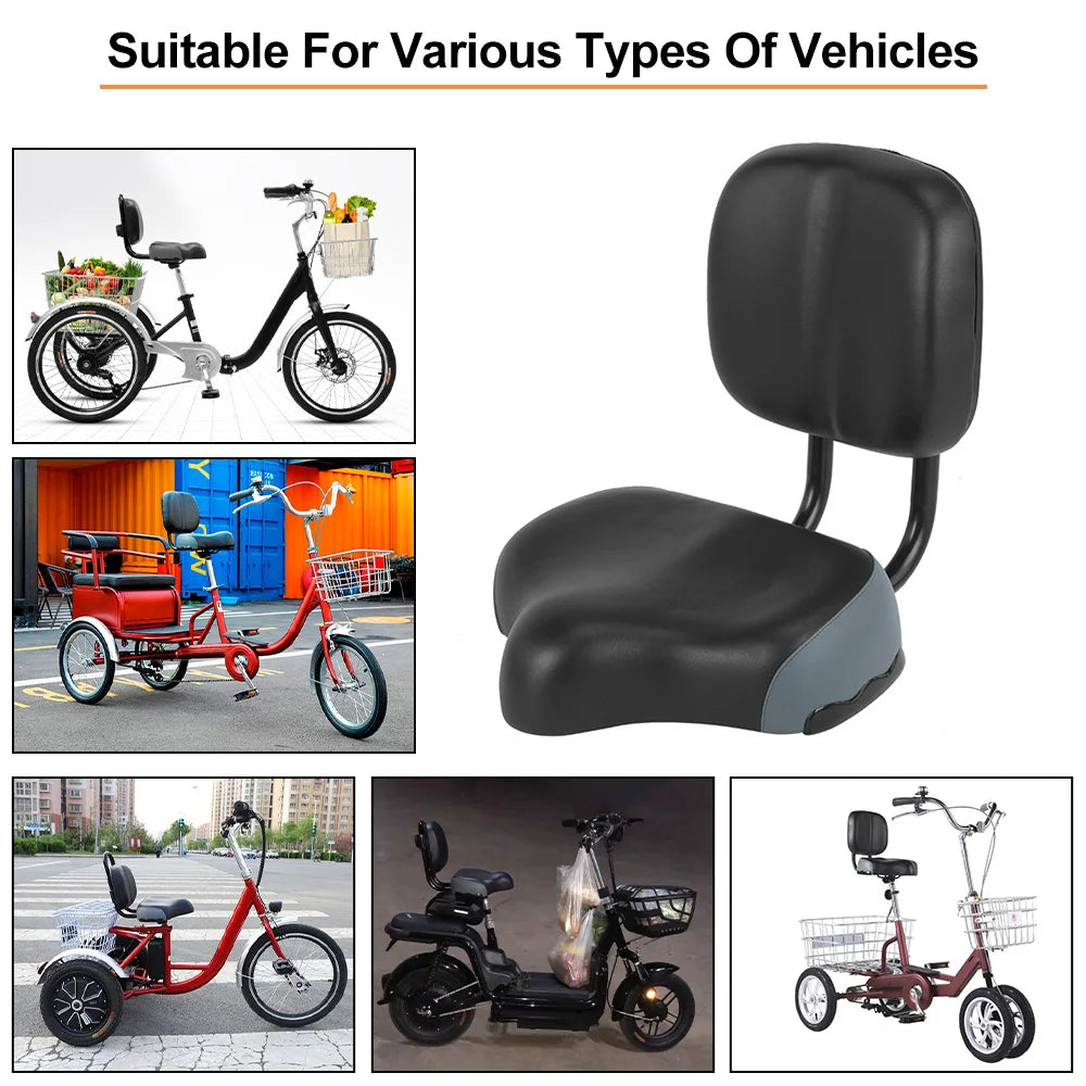Experience unparalleled comfort with our wide saddle seat, designed for both men and women. This versatile bike seat is ideal for spinning bikes, electric bikes, and tricycles, featuring an adjustable backrest for a fit.